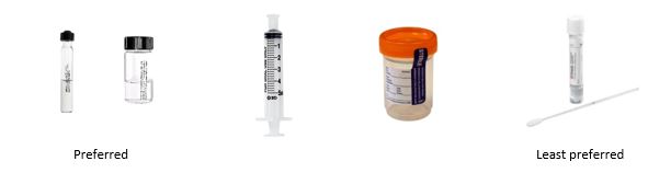 Collection Device: Anaerobic Transport Medium (preferred: jar for tissues, vial for fluids) or capped syringe or sterile container or ESwab (least preferred))