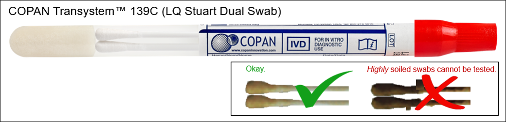 Samples not submitted in COPAN Transystem™ 139C (Dual Swab in Stuarts Media).